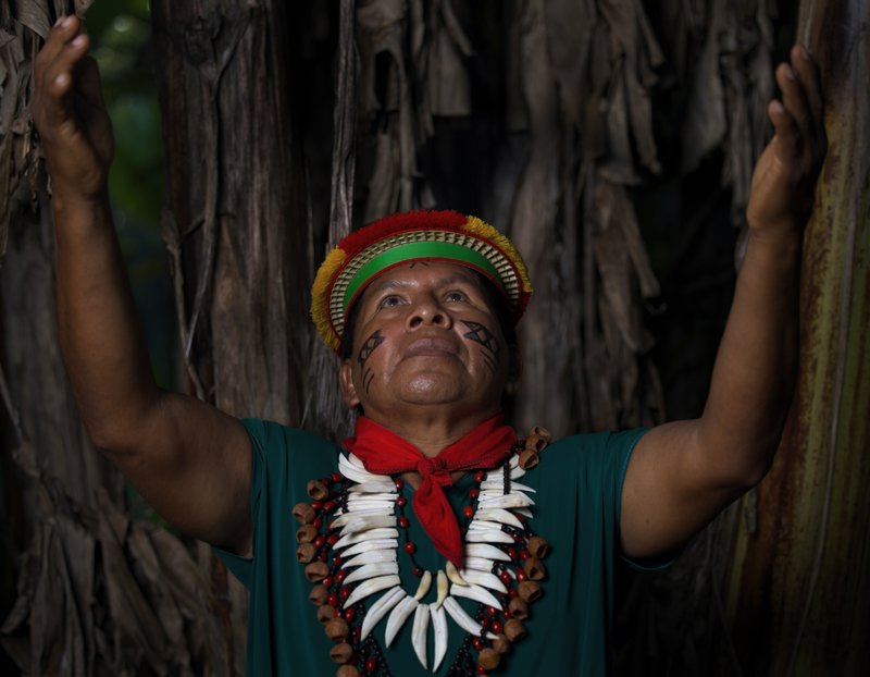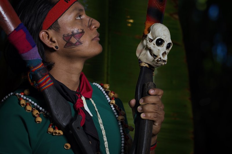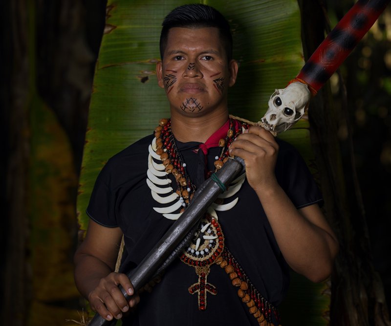 Don Hector, a Cofán shaman, embodies living tradition. He wears a blue tunic, a crown of vivid parrot feathers, a necklace strung with jaguar teeth, and beads draped around his neck. Red markings, reminiscent of a jaguar’s spirit, are painted across his face, echoing the wild heart of the rainforest.
